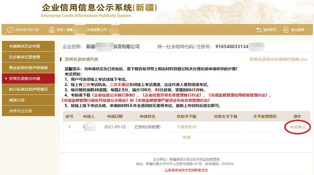企业被列入经营异常名录的自列入之日起3年内,可以通过国家企业信用公示系统(新疆)网站,在线向工商行政管理部门申请移出经营异常名录,申请被受理后,需法定代表人(负责人)认真学习《企业信息公示暂行条例》、《企业经营异常名录管理暂行办法》、《市场监督管理信用修复管理办法》、《市场监督管理行政处罚信息公示规定》和《市场监督管理严重违法失信名单管理办法》,在登记机关指定场所参加闭卷考试,也可通过《国家企业信用公示系统》网站参加在线考试,成绩合格后方可移出经营异常名录。本网站有考试题库,可以助企业取得好成绩。